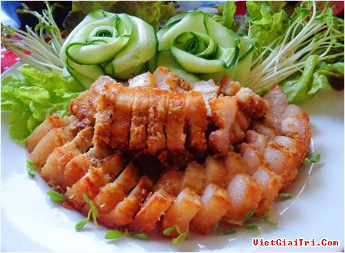 Cứ thỉnh thoảng trở miếng thịt cho thịt chín vàng giòn bên ngoài thì gắp thịt ra đĩa có lót giấy thấm dầu. Chờ thịt hơi nguội, thái miếng vừa ăn.