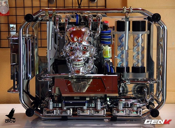 Không thể phủ nhận sự ấn tượng của dàn máy này tới từ phần heatsink CPU được mod hộp sọ đầy sáng tạo. Chiếc máy còn trở nên ấn tượng hơn khi về đêm, với sự kết hợp của đèn led màu xanh và đôi mắt đỏ rực của Kẻ Hủy Diệt.