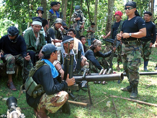 Các chiến binh khủng bố Abu Sayyaf ngồi nghỉ trong một khu rừng ở Philippines. Ảnh: Daily Mail