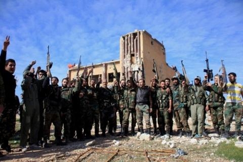 Binh sĩ quân đội chính phủ Syria ăn mừng sau khi phá vòng vây của Nhà nước Hồi giáo quanh căn cứ không quân Kweiris ở Aleppo ngày 11/11.