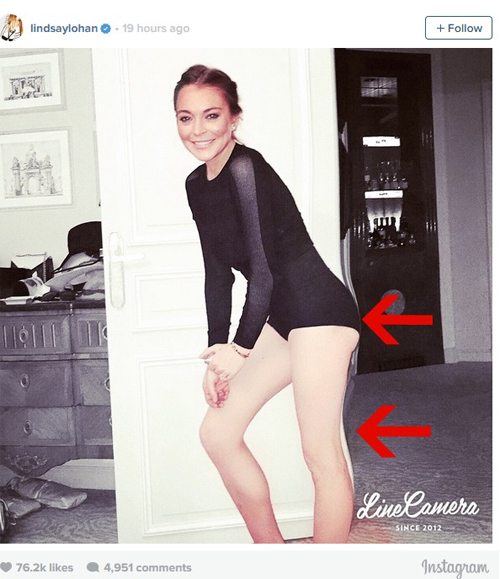 Đầu năm 2015, những bức ảnh được Lindsay Lohan đăng trên Instagram liên tục bị chê bai vì chỉnh sửa cẩu thả. Ví dụ trong tấm hình trên, phần mông đã được kéo ra để trông đầy đặn hơn còn phần chân được làm cho thon, nhưng lại khiến cánh cửa phía sau méo mó một cách kỳ dị.