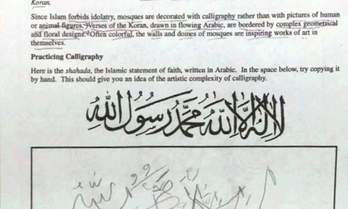 Một loạt trường học tại Mỹ đã phải đóng cửa vì bị tố cho học sinh học về Hồi giáo, đặc biệt là học chữ viết bằng cách chép lại một câu tiếng Arab. Giới chức giáo dục đã giải thích, bài học chỉ mang tính hỗ trợ cho môn địa lý chứ không nhằm mục đích tuyên truyền tôn giáo.