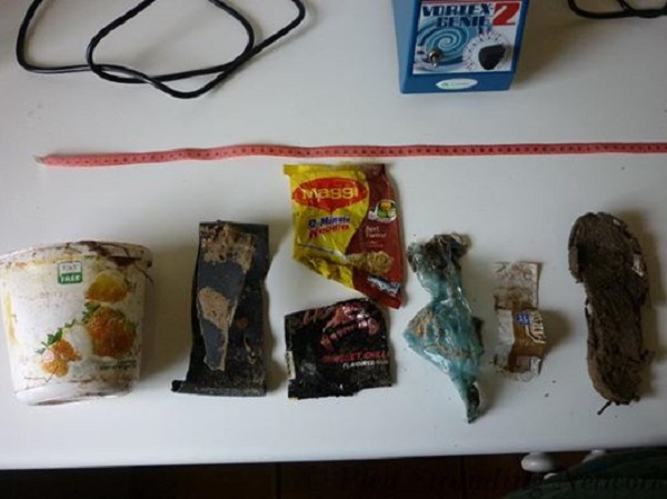 Chú cá voi tội nghiệp này được tìm thấy tại vịnh Plettenberg (Nam Phi) vào ngày 21/12. Khi tiến hành mổ bụng chú cá voi chết, các nhà bảo tồn đã phải sững sờ trước những thứ đồ cuối cùng mà nó đã phải ăn để ngăn cơn đói trước khi chết. Hộp sữa chua đã hết, đế giày cũ, vỏ đồ ăn chỉ là một vài trong hàng đống rác thải được tìm thấy trong bụng chú cá.