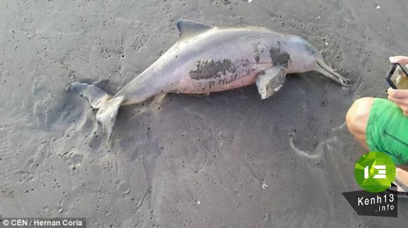 Chú cá heo con đã chết thảm thương vì mất nước sau khi bị 1 nhóm khách du lịch vuốt ve, đùa nghịch và bỏ mặc trên bãi biển ở Santa Teresita, tỉnh Buenos Aires, Argentina.