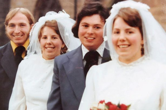 Hai cặp đôi Ann – Ron và Lynda – Derrick trong lễ cưới ngày 15-2-1975. Ảnh: SWNS