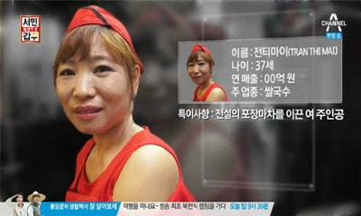 Sinh năm 1980 và có 2 con nhỏ trong khi chồng đã qua đời, chị Trần Thị Mai – cô dâu Việt lấy chồng Hàn Quốc vượt qua khó khăn để đạt được những thành công bước đầu như bây giờ. Quán của cô bán món Phở, món ăn đặc trưng của người Việt và quán luôn tấp nập khách ăn.