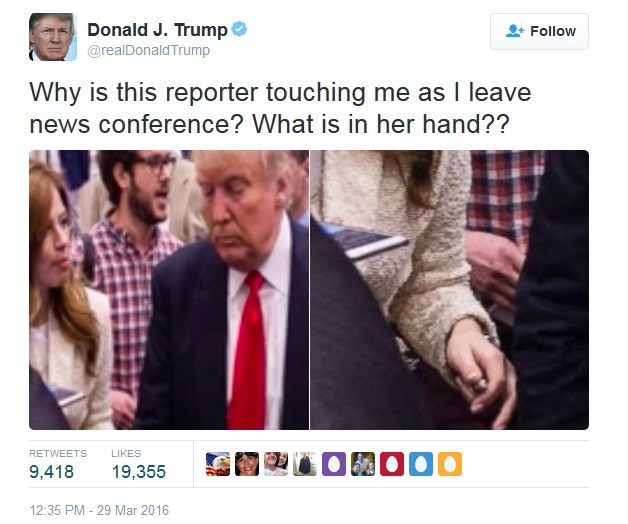 Sau đó ông đã chia sẻ trên trang Twitter cá nhân 1 bức ảnh thu nhỏ chụp tay của nữ phóng viên Fields để gần cánh tay của Trump: "Tại sao cô phóng viên này chạm vào tôi khi tôi rời khỏi cuộc họp báo. Cô ta đang cầm thứ gì trong tay?"