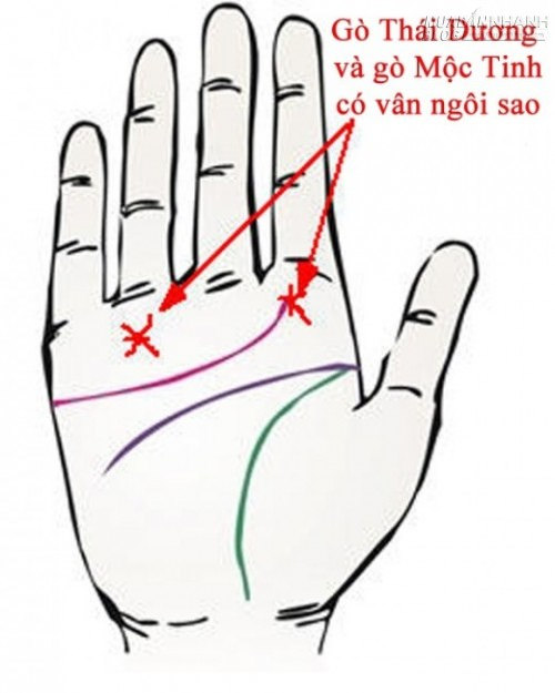 Nếu lòng bàn tay xuất hiện vân ngôi sao ở gò Thái dương (gốc ngón áp út) và gò Mộc tinh (gốc ngón trỏ), điều này chứng tỏ bạn rất may mắn về tiền bạc, luôn có những vận may bất ngờ, điều ước dễ thành hiện thực.