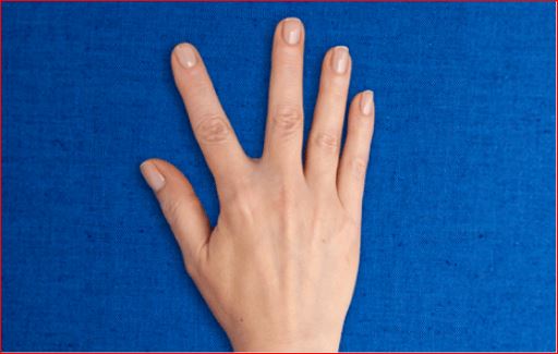 Giơ bàn tay thẳng lên với tư thế thoải mái, gập ngón cái vào lòng bàn tay sao cho đầu ngón cái chạm vào phần cuối của ngón út.