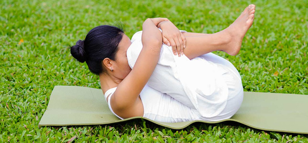 - Bạn thở ra và co đầu gối về phía ngực, đùi áp sát để tạo áp lực lên bụng;