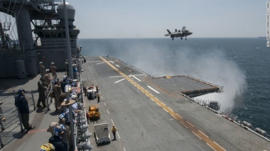 Phiên bản F-35B thử nghiệm hạ cánh thẳng đứng trên tàu đổ bộ tấn công USS Wasp. Ảnh: CNN
