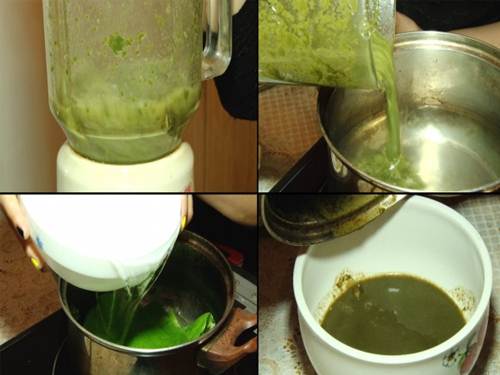Bước 4: Rồi lại đổ hỗn hợp lá trầu không vừa được xay nhuyễn vào nồi đun cho tới khi thấy tạo thành keo cô đặc thì tắt bếp.