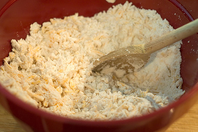 Bật lò ở 180 độ C. Cho bột mỳ, phô mai cheddar cùng với đường vào tô, trộn đều với nhau.