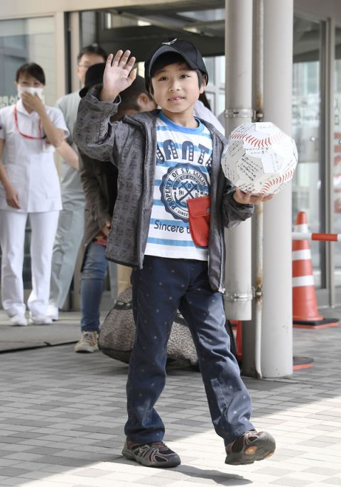 Cậu bé Yamato vẫy tay chào mọi người ngay khi bước ra viện.