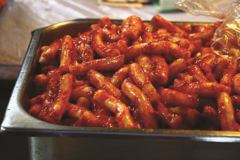 Một trong những món ăn đường phố nổi tiếng ở xứ Hàn là bánh gạo Tokbokki, một loại bánh truyền thống làm bằng bột nếp, xào chung với thịt bò, giá, hành, nấm, cà rốt, hành tây, chả cá… và “linh hồn” của món ăn chính là tương ớt gochujang, khiến người ăn vào phải “bỏng lưỡi” ngay từ miếng đầu tiên.