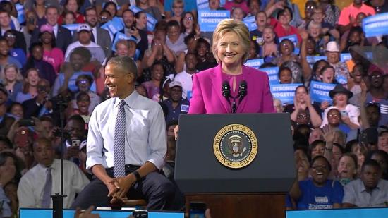 Ứng cử viên Hillary Clinton cùng Tổng thống Obama trong cuộc vận động tranh cử tại Charlottes, bang North Carolina hôm 5/7.