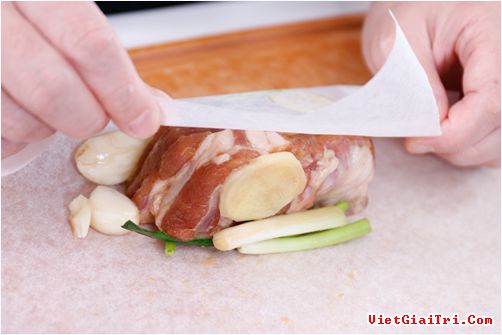 Bước 4: Cho sườn heo đã ướp lên giấy nến, cùng tỏi, gừng, hành lá vừa đủ rồi bọc lại. Bọc lần lượt cho đến hết nguyên liệu.