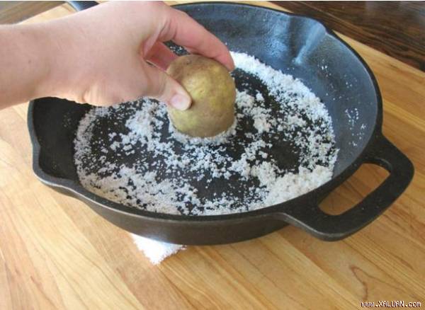 Nhưng bạn có thể dùng nửa củ khoai tây (khoai càng tươi càng tốt) và một chút muối hạt. Di chuyển nửa củ khoai tây trên muối khắp bề mặt chảo, sau đó dùng nước sạch rửa lại, các vết bám trên chảo sẽ hoàn toàn biến mất.