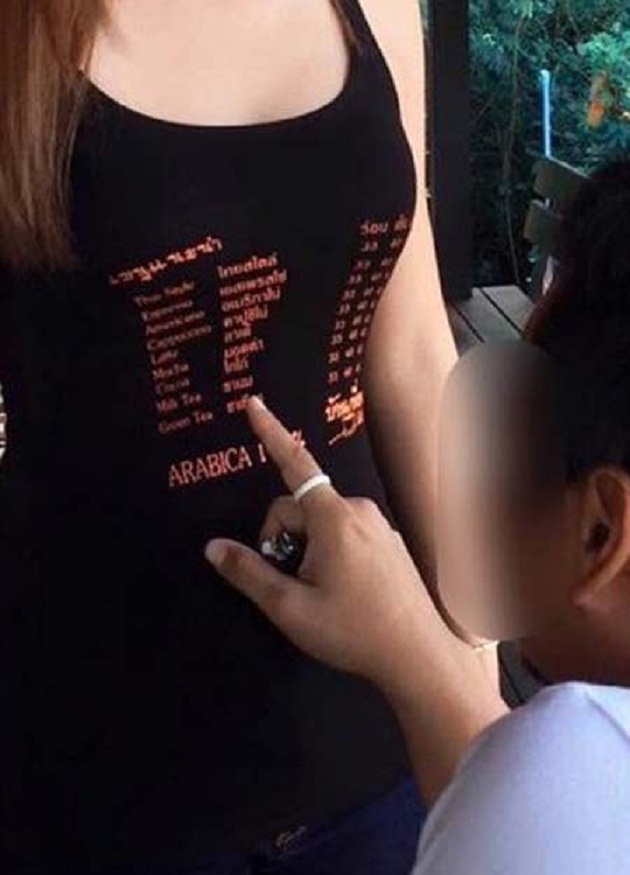 Mới đây, một quán cà phê ở Thái Lan đã gây sốc vì dùng chiêu câu khách là lấy ngực áo của các nhân viên nữ xinh đẹp làm menu. Thông tin này đã được lan truyền nhanh chóng trên các trang mạng xã hội và gây ra nhiều tranh cãi.