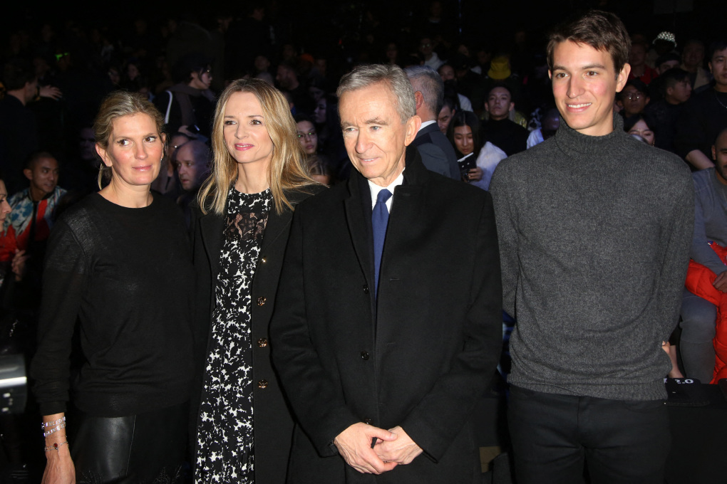 Từ trái sang gồm khách mởi, Delphine Arnault, Bernard Arnault và Alexandre Arnault tại buổi trình diễn của Louis Vuitton tại Paris 17/1/2019. Ảnh: Reuters