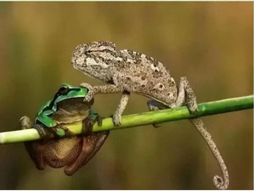 Nhiếp ảnh gia nổi tiếng người Thổ Nhĩ Kỳ - Senel trong chuyến thăm một trường đại học đã chụp được khoảnh khắc khá thu vị về thế giới động vật. “Một con cóc ồn ào đang quấy rối một con tắc kè hoa, tắc kè hoa trèo lên cành cây và đã bịt miệng con ếch”, một bức ảnh thật sự rất chân thực và thú vị.