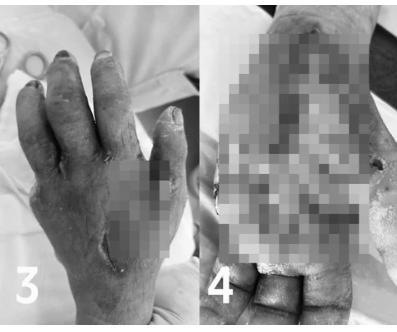 Người phụ nữ đến bệnh viện khi tổn thương đã lan khắp bàn tay, hoại tử một phần da và ngón V (ngón út) bị hoại tử đen, buộc phải tháo bỏ.