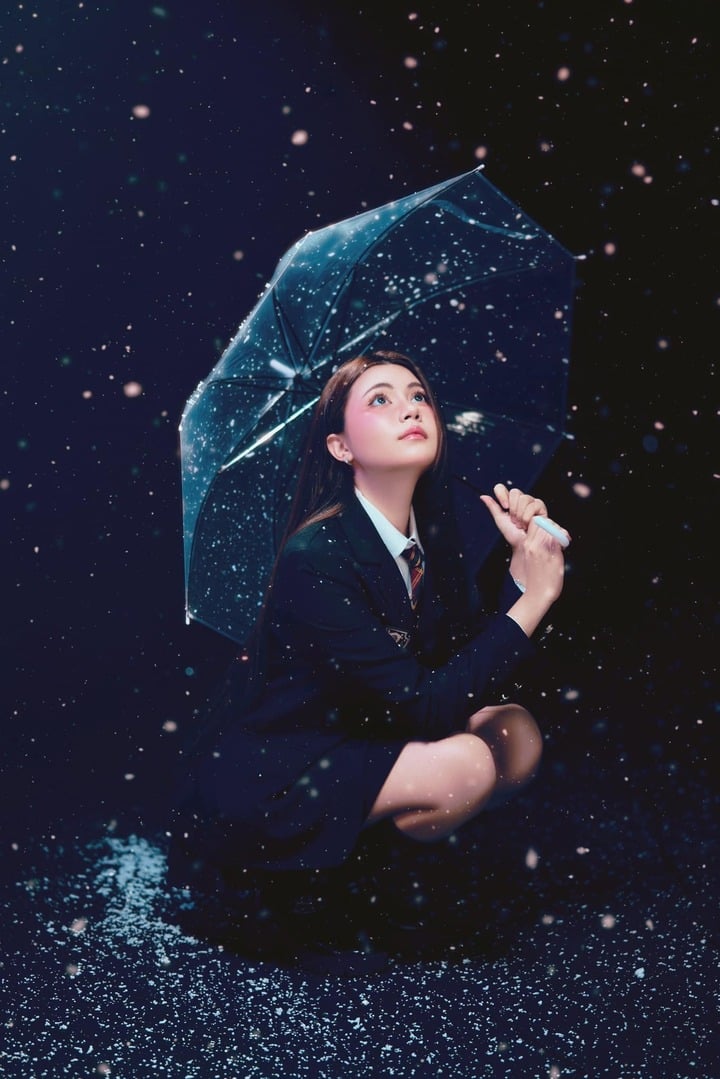 Khung hình trở nên mộng mơ, lãng mạn hơn với hiệu ứng tuyết rơi nhẹ cùng đạo cụ pháo bông, chiếc ô trong suốt.
