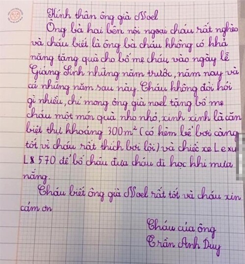 Ông bà hai bên nội ngoại cháu rất nghèo, và cháu biết là ông bà cháu không có khả năng tặng quà cho bố mẹ cháu vào ngày Lễ Giáng Sinh những năm trước, năm nay và cả những năm sau này. Cháu không đòi hỏi gì nhiều, chỉ mong ông già Noel tặng bố mẹ cháu một món quà nho nhỏ, xinh xinh là căn biệt thự khoảng 300m² (có kèm bể bơi càng tốt vì cháu rất thích bơi lội) và chiếc xe Lexus LX570 để bố cháu đưa cháu đi học khi mưa nắng. Cháu biết ông già Noel rất tốt và cháu xin cảm ơn.