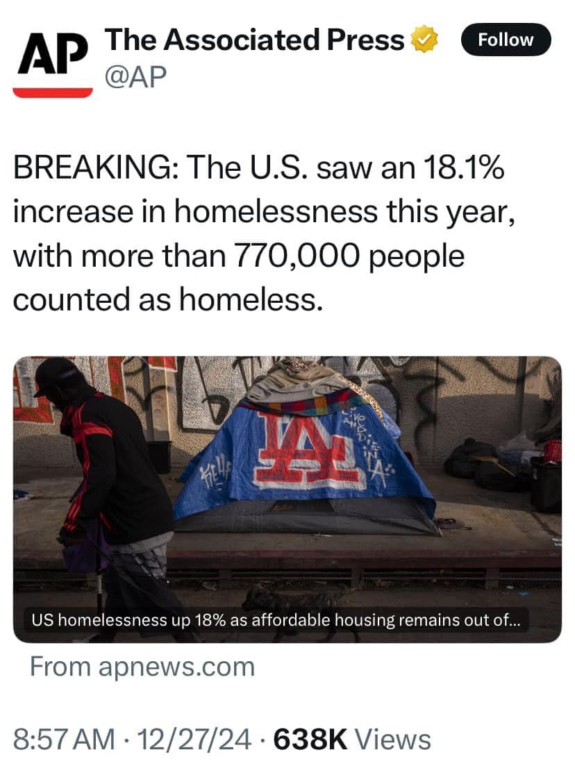 Trong năm nay số người vô gia cư tăng 18.1% với hơn 770,000 người. Cứ trong 400 người Mỹ thì có 1 người vô gia cư.