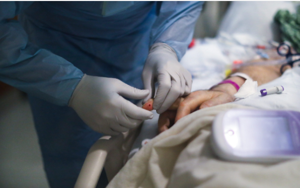 Y tá kiểm tra đường huyết bệnh nhân tại bệnh viện Sharp Grossmont Hospital ở La Mesa, california, ngày 5 Tháng Năm, 2020. (Hình minh họa: Mario Tama/Getty Images)