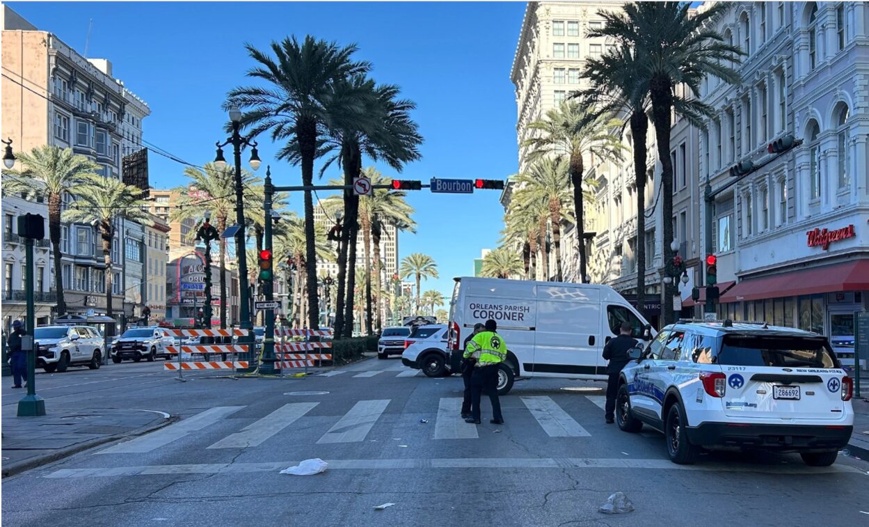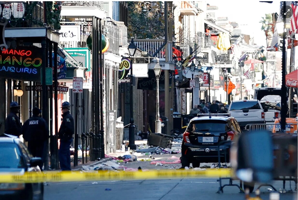 Tại ngã tư trung tâm của New Orleans đông đúc du khách, với những hàng cây cọ cao và những khách sạn cao tầng, sự yên tĩnh vào sáng đầu năm mới chỉ bị phá vỡ bởi dải băng cảnh sát màu vàng bay trong gió và tiếng còi hú thỉnh thoảng vang vọng trên đường.