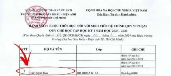 Cụ thể vào ngày 30/3/2024, ông Lê Hùng, Trưởng phòng đào tạo của Đại học Sân khấu Điện ảnh TP.HCM xác nhận với Tri thức - Znews Hoa hậu Bùi Quỳnh Hoa đã bị buộc thôi học tại trường. Quyết định này được ra vào 26/3 và đã gửi tới Bùi Quỳnh Hoa cũng như gia đình.