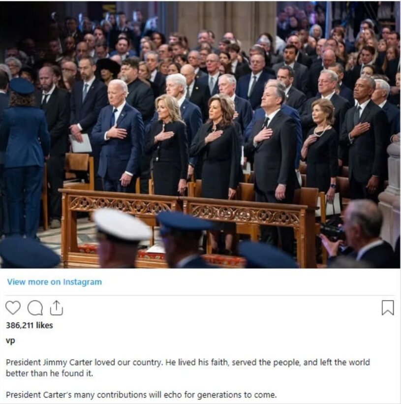 "Cựu Tổng thống Jimmy Carter yêu đất nước chúng ta. Ông đã sống theo đức tin của mình, phục vụ người dân và để lại thế giới tốt đẹp hơn. Những đóng góp của cựu Tổng thống Carter sẽ vang dội qua nhiều thế hệ", chú thích bức ảnh trong bài đăng trên trang mạng xã hội chính thức của bà Harris có đoạn.
