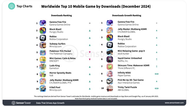 Garena Free Fire giữ vững vị trí là trò chơi di động được tải xuống nhiều nhất trên toàn cầu. Block Blast! xếp thứ 2, tiếp theo là Roblox, Subway Surfers và Pokémon TCG Pocket là những cái tên top đầu.