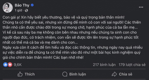 Cô viết: "Con gái ạ! Xin hãy biết yêu thương, bảo vệ và quý trọng bản thân mình! Chúng ta có thể yêu sai, nhưng xin đừng để mình có con với sai người! Các thiên thần nhỏ cần được chào đời trong sự mong chờ, hạnh phúc của cả ba lẫn mẹ... Vì kể cả sau này ba mẹ không còn bên nhau nhưng nếu chúng ta sinh con cho người đạo đức, có trách nhiệm, con vẫn sẽ được lớn lên trong sự hạnh phúc tốt nhất có thể mà cả ba và mẹ dành cho con. Ngày xưa còn ít cách để tìm hiểu và đọc các thông tin, nhưng ngày nay quá nhiều sự việc diễn ra để chúng ta có thể nhìn vào đó như một bài học kinh nghiệm quý giá cho chính bản thân mình! Các bạn nhớ nhé!".