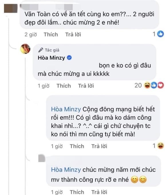 Mới đây, Hoà Minzy đã đăng tải bức ảnh gây chú ý. Dưới phần bình luận, đa số khán giả không quên hỏi thăm tình trạng sức khỏe của người đẹp mà còn đồng thời hỏi thêm về cầu thủ Văn Toàn. Cụ thể, người này hỏi rằng: "Văn Toàn có về ăn Tết cùng không em? Hai người đẹp đôi lắm. Chúc mừng hai em nhé!". Trước bình luận này, Hòa Minzy hài hước phản hồi lại: "Bọn em không có gì đâu mà chúc mừng anh ơi".