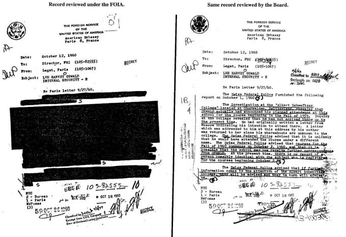 "CIA tin rằng tất cả thông tin quan trọng có liên quan trực tiếp đến Oswald đã được công bố", người phát ngôn cho hay. "Một số ít thông tin còn lại được kiểm duyệt để bảo vệ tên nhân viên CIA, nguồn tin, địa điểm và các kỹ thuật thu thập thông tin tình báo của chúng tôi".