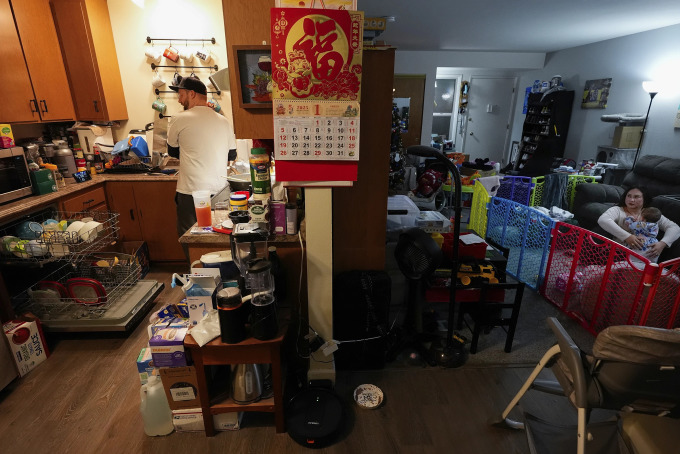 Steve Petersen rửa chén trong bếp và vợ Jenn Petersen chơi với con gái Carolynn ở pḥng khách, ngày 15/1/2024. Ảnh: AP