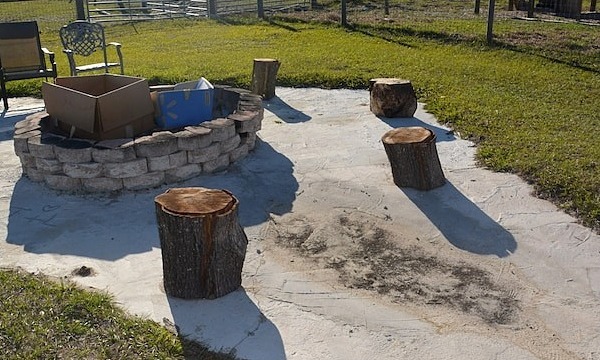 Vết trũng có kích thước bằng cơ thể người trên mặt xi măng gần bếp lửa ở sân sau nhà Shaver. Ảnh: Lake County Sheriff’s Office