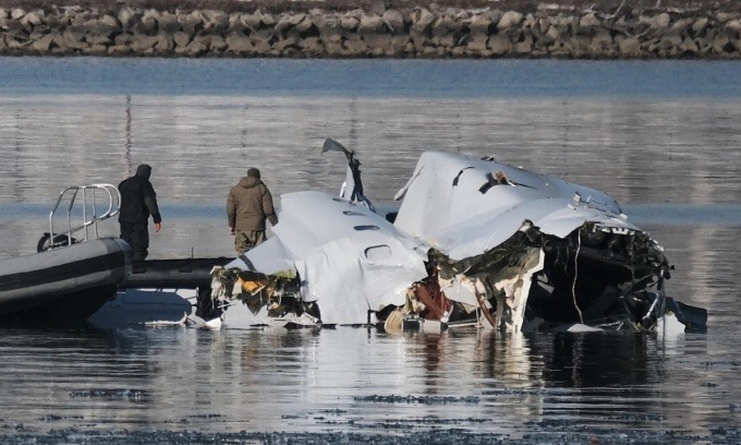 Lực lượng ứng cứu có mặt tại hiện trường vụ tai nạn máy bay của PSA Airlines và trực thăng lục quân Mỹ dọc theo sông Potomac gần Sân bay Quốc gia Ronald Reagan hôm 30/1. Ảnh: NPR