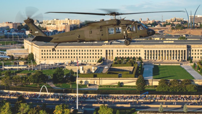Trực thăng UH-60 Black Hawk thuộc Tiểu đoàn 12 bay qua Lầu Năm Góc trong cuộc diễn tập tháng 8/2023. Ảnh: US Army