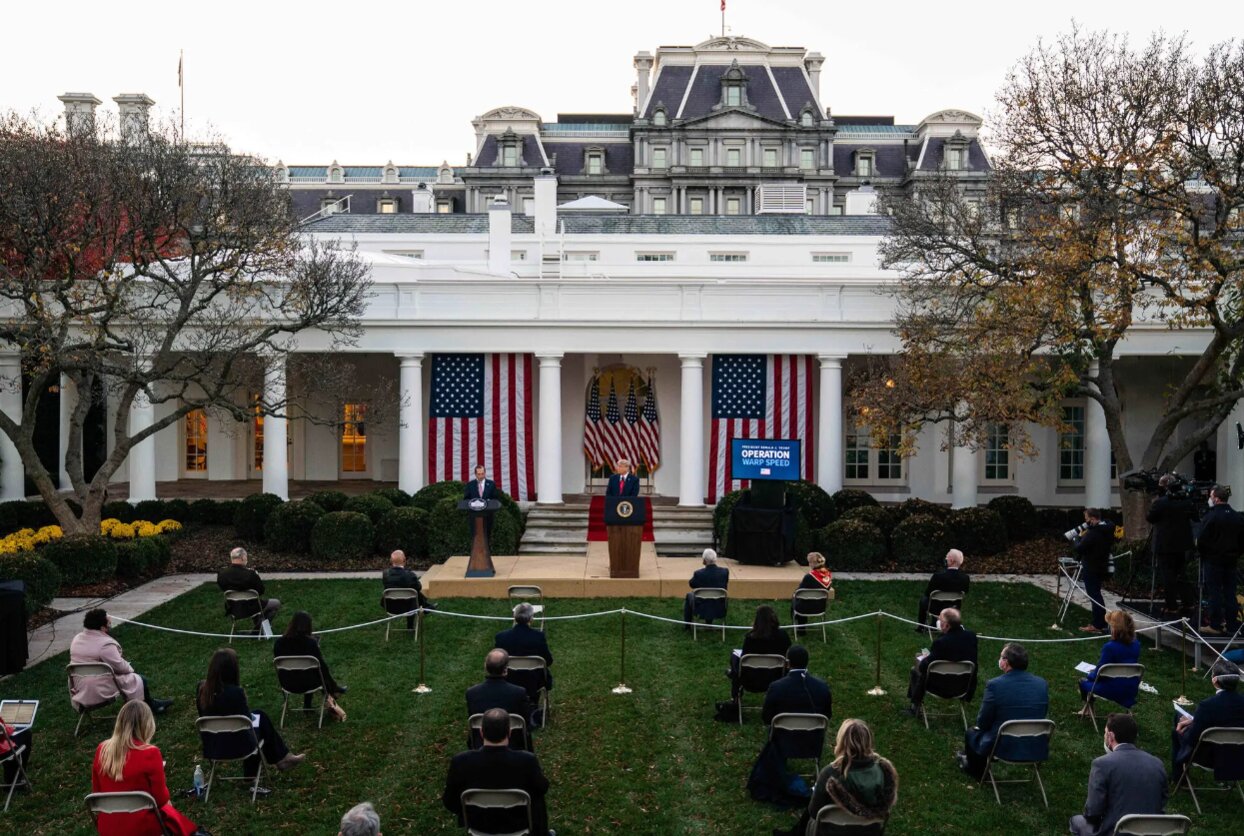 Tổng thống Trump phát biểu trên bãi cỏ tại Vườn Hồng của Nhà Trắng trong nhiệm kỳ đầu tiên của ông, năm 2020. Ảnh: New York Times
