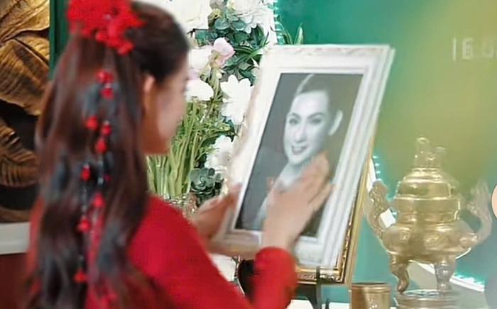 Tuyết Nhung nghẹn ngào trước di ảnh mẹ nuôi. Ảnh: Mộc Film