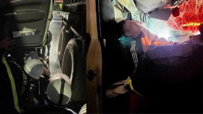 Tài xế xe tải bị thương, mắc kẹt bên trong cabin biến dạng.