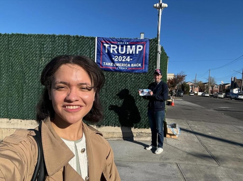 Kaya Walker chụp ảnh trước áp phích ủng hộ ông Trump trong chiến dịch tranh cử năm 2024. Ảnh: NYP