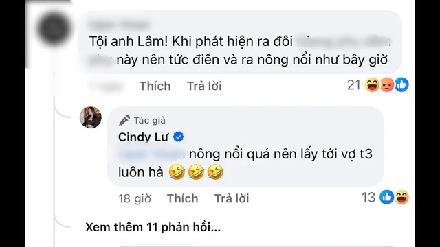 Sau khi tố Hoài Lâm là người ly hôn trước vì có người mới ở quê, không chu cấp cho hai con gái chung, Cindy Lư mới đây tiếp tục gây xôn xao khi đáp trả một bình luận cho rằng cô là người khiến chồng cũ trở nên nông nổi, bất ổn. Cô mỉa mai:"Nông nổi quá nên lấy tới vợ thứ ba luôn hả".