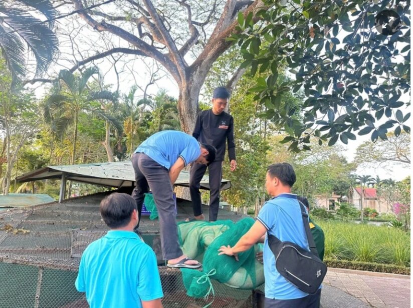 Ngày 2/3, Trại rắn Đồng Tâm (xã Bình Đức, huyện Châu Thành, tỉnh Tiền Giang) tổ chức tiếp nhận con trăn đất khổng lồ từ người dân nuôi tôm ở thị trấn Trần Đề, huyện Trần Đề, tỉnh Sóc Trăng.
