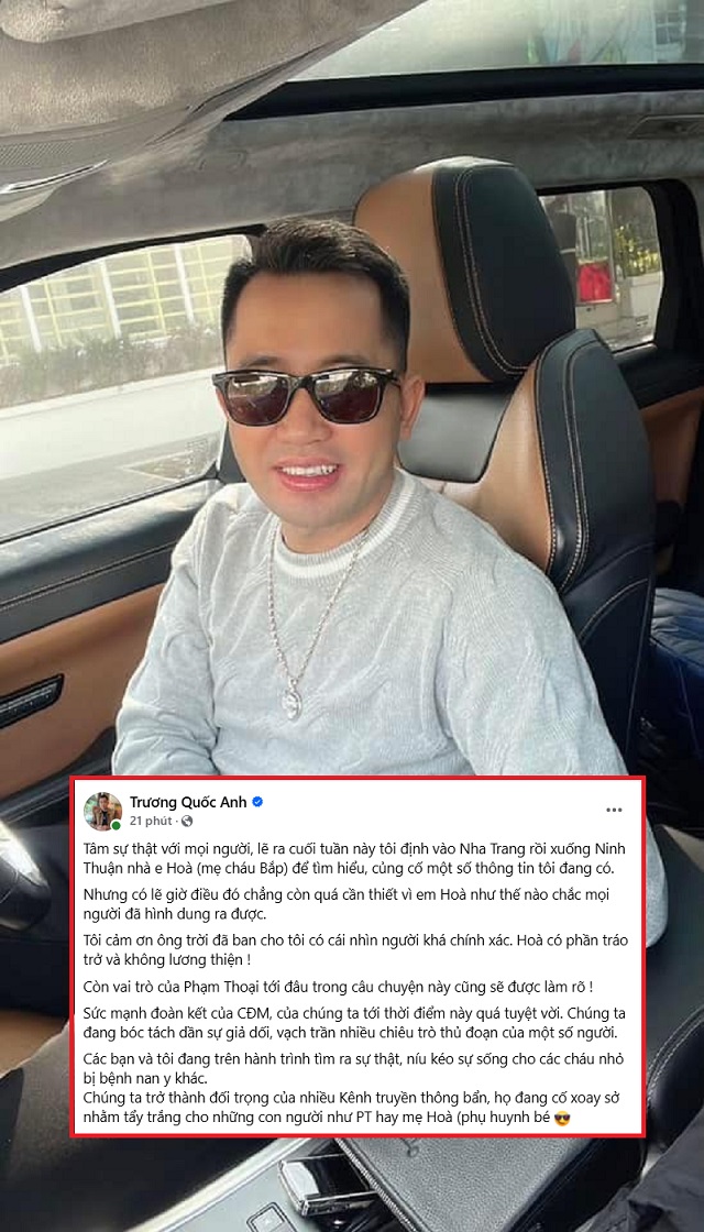 Chiều 3/3, trên trang Facebook cá nhân, TikToker Trương Quốc Anh đã đăng tải bài viết cập nhật về vụ việc sao kê từ thiện của mẹ Bắp và Phạm Thoại. Anh cho biết bản thân dự định cuối tuần này sẽ vào Nha Trang rồi xuống Ninh Thuận nhà của chị Hoà - mẹ cháu Bắp - để tìm hiểu, củng cố một số thông tin đang có. Tuy nhiên, nam TikToker hiện tại cảm thấy việc này không còn cần thiết nữa.