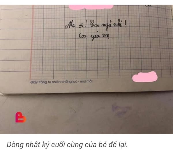 Con nói "mẹ, con ngủ nhé" rồi con lịm đi và không bao giờ tỉnh nữa. Con đã cố để ra đi không đau đớn. Bé con của tôi khi đó mới lớp 5, còn bao nhiêu ước mơ dang dở, nhật ký con viết có dòng cuối cùng "Mẹ ơi! Con ngủ đây. Con yêu mẹ".