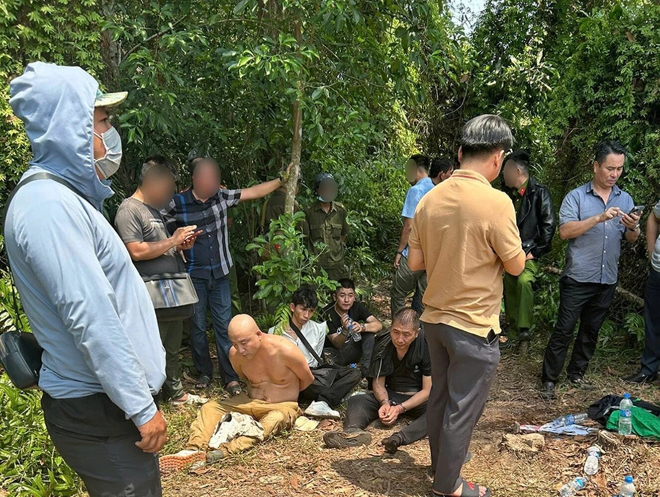 Nhóm nghi can (ngồi) bị công an bắt giữ trong khu vực hiểm trở ở xã Phạm Văn Hai, huyện Bình Chánh, Sài Gòn. (Ảnh: HT/Pháp Luật TP.HCM)
